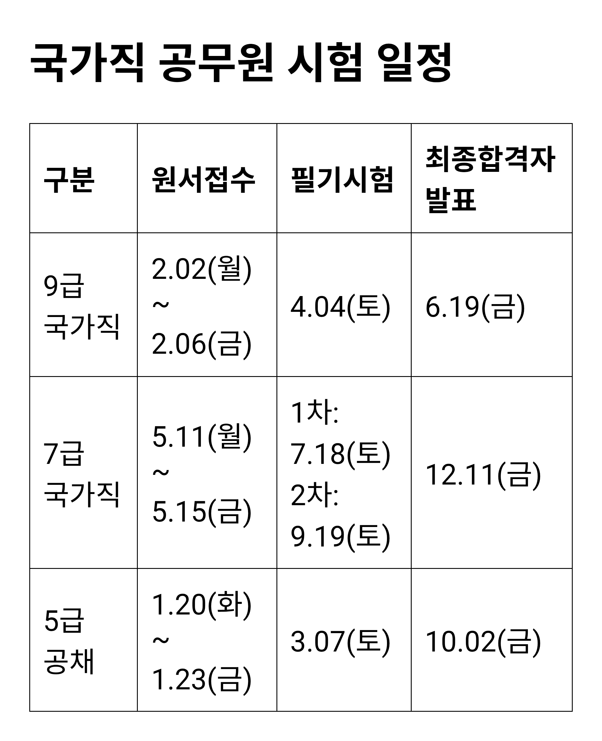 7급 국가직 / 5.11(월) ~ 5.15(금) / 1차: 7.18(토) 2차: 9.19(토) / 12.11(금)